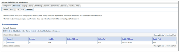 What we are doing here is configuring the default WebLogic access channel to externally listen on an IP Address, which is associated with the first VM, so there is no need to do anything else. If we had a Public IP Address associated to each of the Managed Servers in the cluster, we would need to do the same for each of the other managed Servers in the cluster. However since the first VM is the only one that has an external IP Address, now we have to configure a separate channel that will allow direct communication over t3 with the Admin Server.