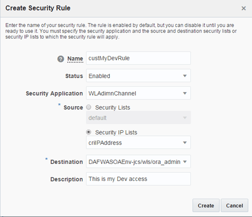 We are done configuring WebLogic. The last step is to grant access to JDeveloper into the SOA CS Compute Cloud Network Firewall rules.