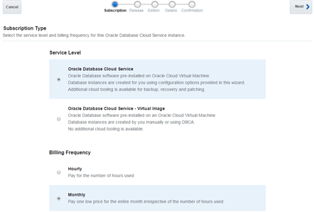 Specify the desired Subscription Type and Billing Frequency. Then click Next. In my case I selected Oracle Database Cloud Service and Monthly billing.