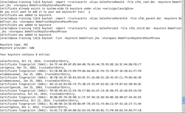 keytool -import -trustcacerts -alias SalesForceCA -file sfdc_child.der -keystore DemoTrust.jks -storepass DemoTrustKeyStorePassPhrase