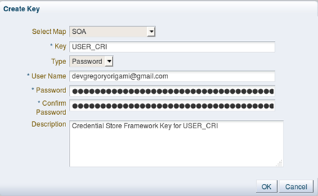 • Add a new Credential, by clicking on the green plus icon. Make sure to use the same CSF Key that you used configured in WebLogic within the “SOA” Map. For more information read “Configuring CSF Key on Enterprise Manager Console” section in this document: