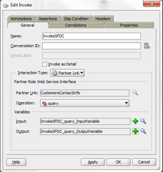 • Open the BPEL service and create an “Invoke” operation pointing to the SFDC Adapter. Also select default variables.
