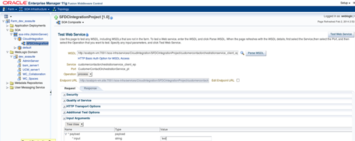 • Once it is deployed, test the service via the “Fusion Middleware Control Enterprise Manager Console”. Notice that since at this point you are not mapping neither the inputs nor the outputs, you can leave the fields blanks. The purpose of this testing is to verify the seamless integration to Salesforce.com via the Oracle Cloud Adapter.
