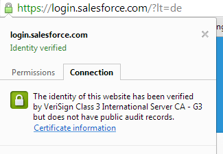 • Export Salesforce.com server certificate. The easiest way to do it is from the browser when attempting to login