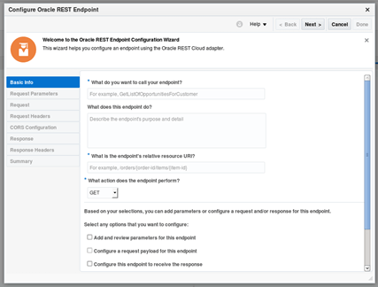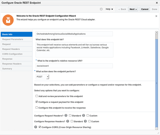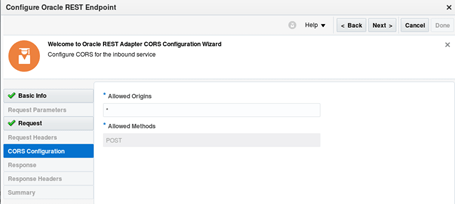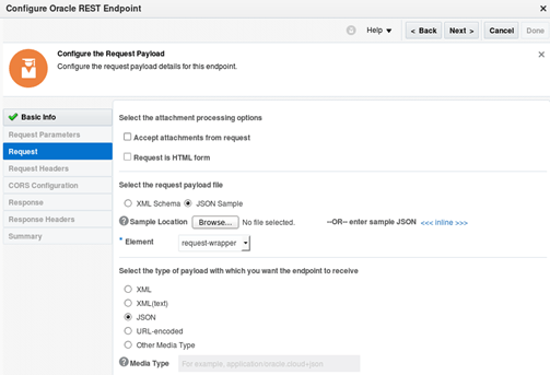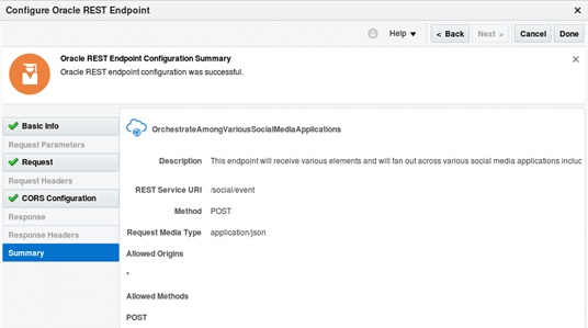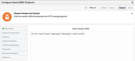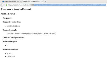 Notice that it will show you the Metadata descriptor of your REST API endpoint, for example, the Accepted Media Type, A JSON request sample, Allowed methods, CORS configuration, etc.