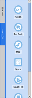 Now, we are going to continue building the orchestration. Notice in the left that you have 2 menus. Actions and Invokers. If you have experience in BPEL this will result very familiar.