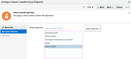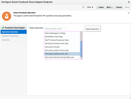 - Click Next. Select the Operation that you want, in this case, “Post status update of the user“