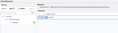 In the mapper you will drag the message elements under “request-wrapper” into the target structure. Notice that the structure within “request-wrapper” is the one that you defined when creating freely the JSON payload that you are expecting as input. Pretty cool huh? Follow the next mappings: