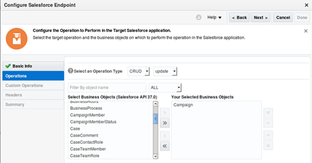 - Click Next. Select Update as the CRUD operation and search for the Campaign Business Object and move it to the right panel.
