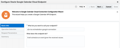 - It will show you the Google Calendar connection wizard. Enter a name and description.