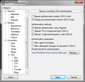 Once you generated your key pair, all you have to configure in PuTTY the private key in a connection where you intend to SSH to an environment that was provisioned using its associated public key. In order to setup the Private Key in PuTTY for a given connection, you have to select the PPK key file under Connection > SSH > Auth, as shown below: