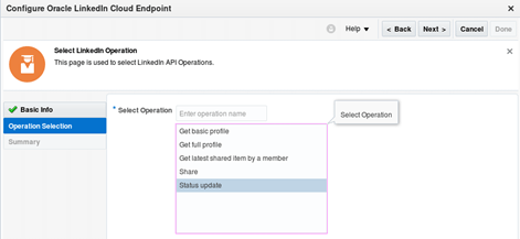 - Click Next. Select “Status Update” from the allowed Operations – This will allow update status on the user’s LinkedIn timeline. For example, when the user writes something on their timeline. Then click Next.