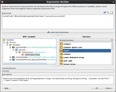 - Set the dn element to be of the form: uid=[inputvariable],ou=users,ou=system – For this use a simple concat XPATH function in the Expression Builder