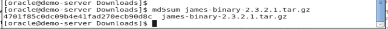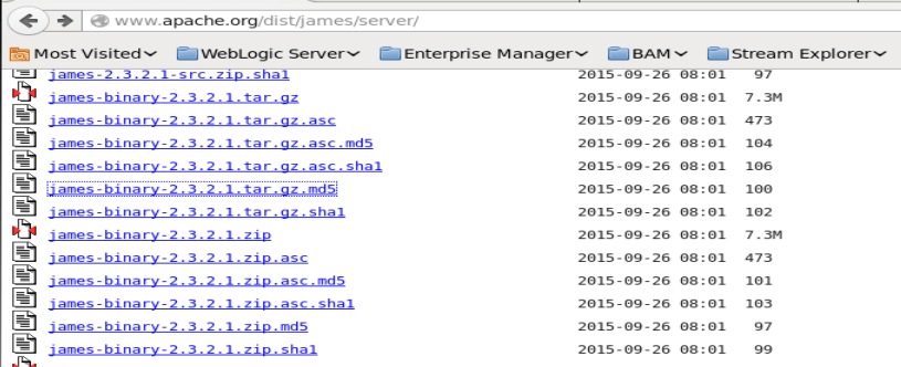 Once your download is complete, on the download site navigate to and click the james-binary-2.3.2.1.tar.gz.md5 link to reveal the MD5 checksum
