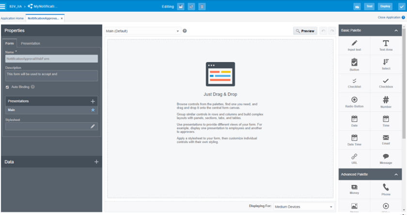 - A new JET based web form palette will be shown. You can drag and drop any action from the palette into the canvas.