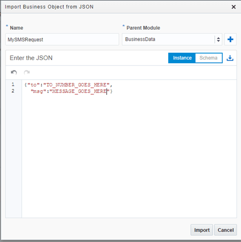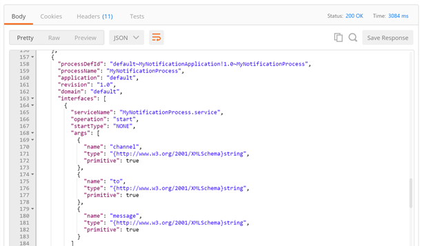 | { “processDefId”:”ENTER_YOUR_PROCESS_DEF_ID“, “serviceName”:”ENTER_SERVICE_NAME“, “operation”:”start”, “payload”:”<ENTER_YOUR_BUSINESS_OBJECT_NAME xmlns=’http://xmlns.oracle.com/bpm/bpmobject/BusinessData/ENTER_YOUR_BUSINESS_OBJECT_NAME‘> <ENTER_ARGS_1>[sms|voicecall]ENTER_ARGS_1> <ENTER_ARGS_2>+MOBILE_GOES_HEREENTER_ARGS_2> <ENTER_ARGS_3>MESSAGE_GOES_HEREENTER_ARGS_3> ENTER_YOUR_BUSINESS_OBJECT_NAME>”, |