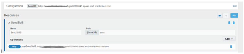 - Click on Add to create the first resource. Then click on the resource and give it a sensible name. Also define the specific path location for this REST resource. For example, in my case, this is my SMS resource and it will follow the structure: {baseUrl}/sms