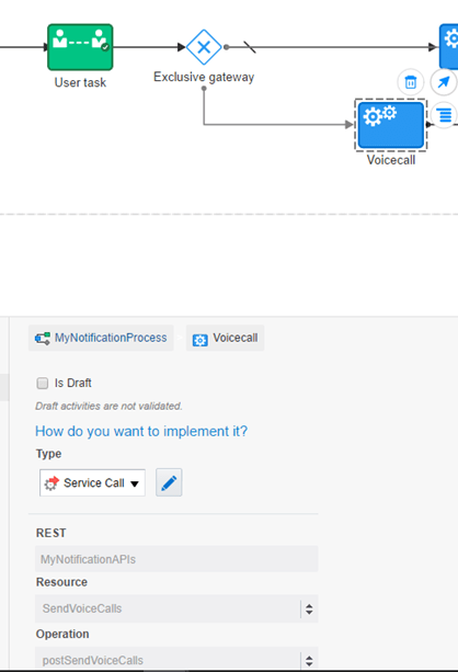 - Back in your Process flow, click on the Exclusive gateway link that goes from it into the Voicecall service call.