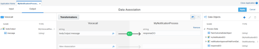 - On the left tree, expand Process Data -> myNotificationDO and on the right tree, expand Voicecall -> body