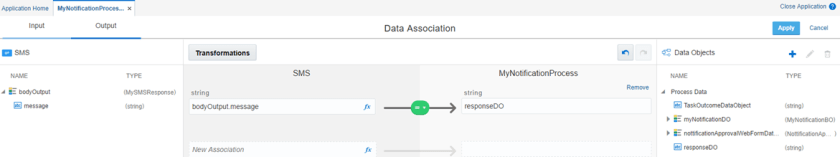 - Now, click again on the SMS action -> burger menu -> Open Data Association. Set the Request and Response Data association accordingly.