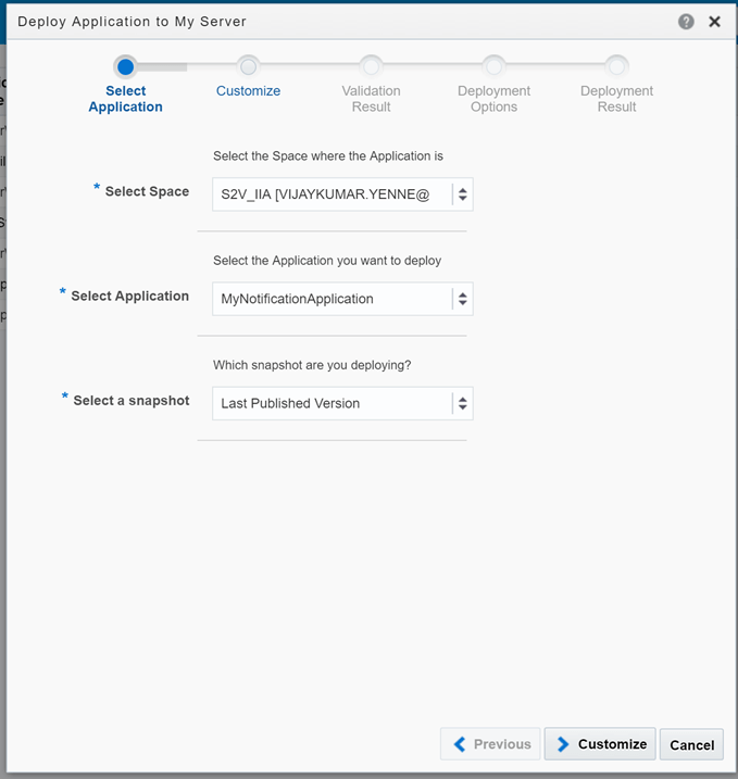 - Select your Space, your Application and select “Last Published Version” when it asks you to Select a snapshot.