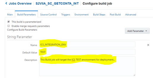 • Then set its Default Value as the ICS environment that you want to deploy to. This has to match with the name of your environmental file that you created previously and that you pushed into your git repo, i.e. env-[DEV|TEST|PROD] – In my case I used TEST.