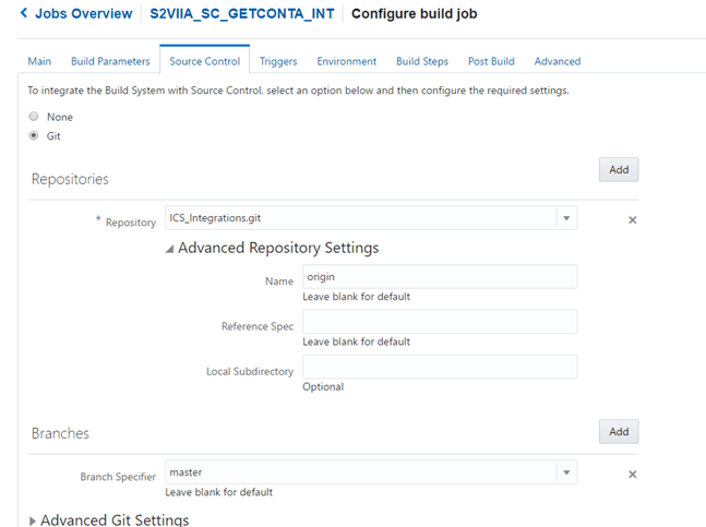 • Now Click on the “Source Control” sub-tab. Drop down the URL and select your ICS_Integrations Git repository.
