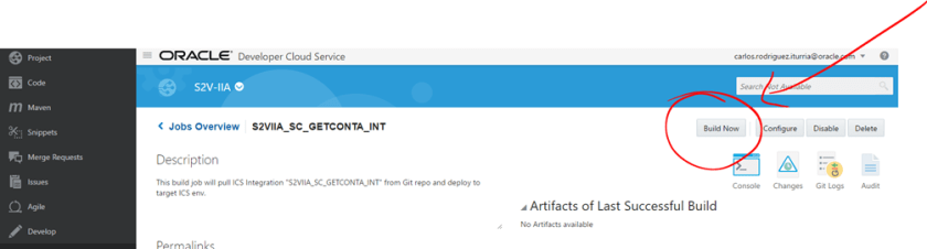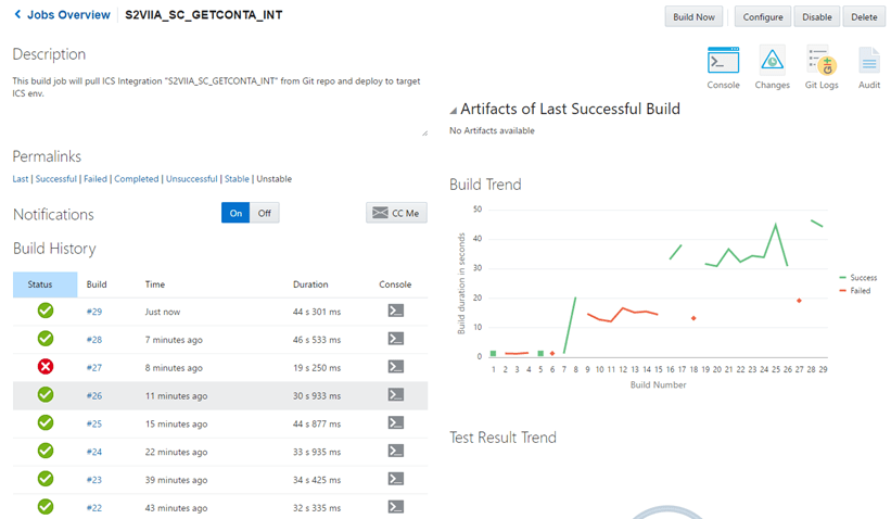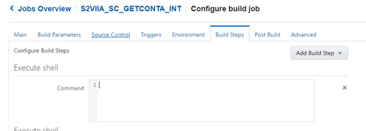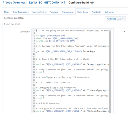 • Click on the “Build Steps” sub-tab. This is where we are going to invoke the ICS system APIs to deploy and activate our ICS Integrations. This APIs are well explained in this blog that I have been referring across this article.