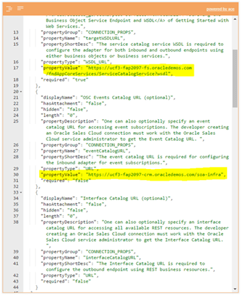 Note: Before proceeding, make sure all your Connectors’ configurations are in the right folder and fully configured, i.e. Based on the nature of the ICS connector, you might need to setup WSDL locations, WS endpoints, usernames, passwords, etc. For example, for my ICS Integration I don’t need to do anything for my REST Connector JSON file. However, for my Sales Cloud Connector, I need to setup the targetWSDLURL, eventCatalogURL and Sales Cloud credentials: