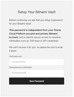 You need to setup your Bitnami Vault – Make sure to store it securely somewhere, for future access to sensitive information.