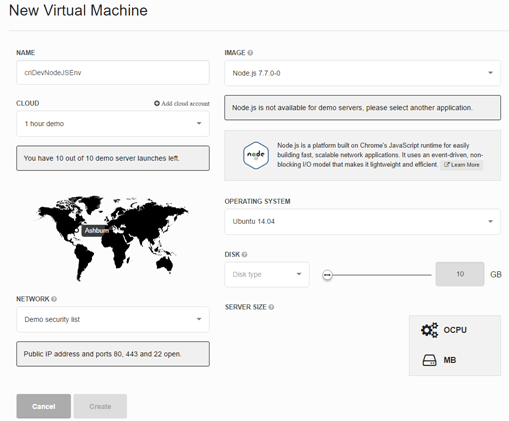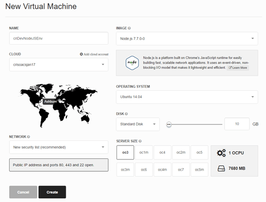 Notice that now it has a configured Oracle Public Cloud account and now Server Size is fully populated. These are Oracle Public Cloud shapes for compute and memory size.