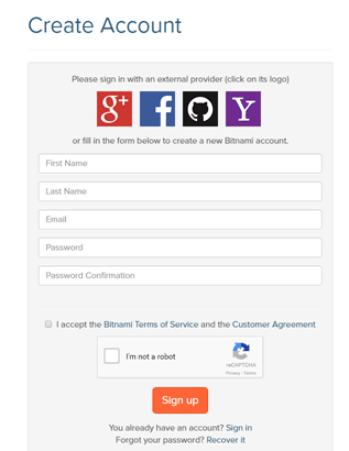- Creating the Account was simple, I could’ve used an existing account with Google, Facebook, Github, etc. In my case I decided to simply enter a few fields and prove that I was not a robot. Then, in less than 5 seconds I had a Bitnami account