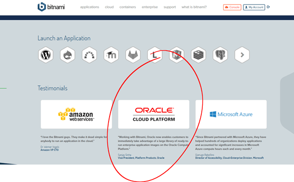 As you will see in this blog, Bitnami allows you to quickly and easily choose from hundreds of pre-configured VM images and spin them up across major Public Cloud providers, such as Oracle, Amazon and Microsoft. See https://bitnami.com/ for more information.