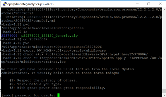 Note: the instructions say to target the $MW_HOME/OPatch/patches directory but as this is owned by oracle, the opc user doesn’t have privileges.