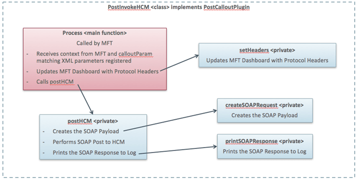 Our sample is a single file called PostInvokeHCM.java, which must implement PostCalloutPlugin interface (oracle.tip.mft.engine.processsor.plugin.PostCalloutPlugin).