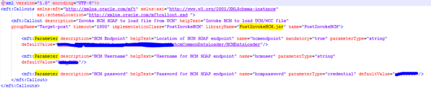 Create the PostInvokeHCM.xml file which describes the Callout and the input it takes, as shown below. These file is required inform MFT of the callout’s existence and what fields to pass into it.