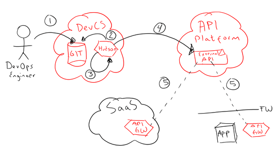 1. DevOps engineer pushes into the corporate Git repository the policy configuration of a “new external API” to be created and deployed (which wraps a system or internal API),