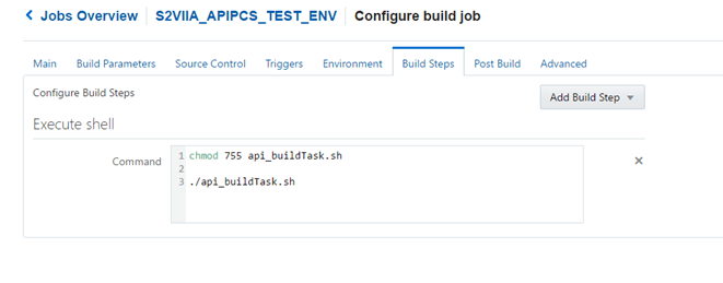 Click on the “Build Steps” sub-tab. This is where we are going to invoke the api_bodyTask.sh script. to create and deploy the APIs.