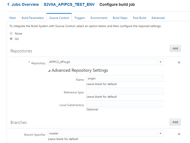 - Now Click on the “Source Control” sub-tab. Drop down the URL and select your Git repository.