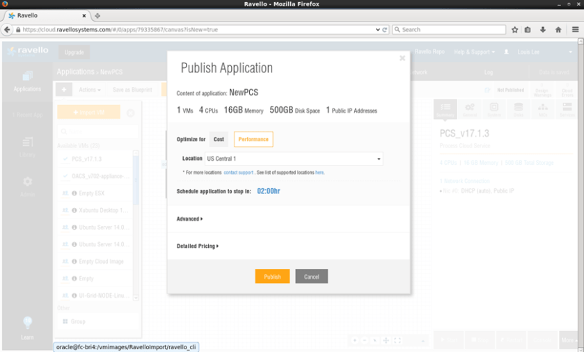 - After we configured the application it’s time to publish it. There are a couple of choices here – optimize for performance or optimize for cost. If we choose performance, we have control of the location. If we choose cost, then the application will be published in the best location based upon price. There is also an option to set how long the application is started. This is great for those demonstrations and we want it running for a short period of time.