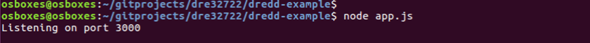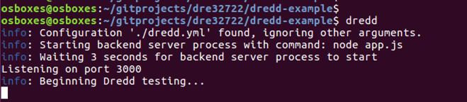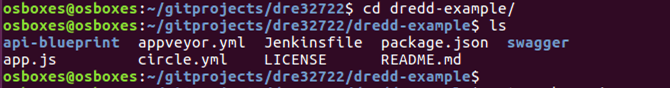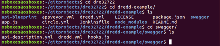 Next, I cd into the /home/osboxes/gitprojects/dre32722/dredd-example project directory.