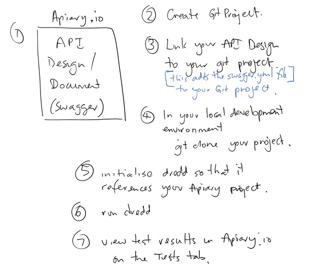 Once these steps have been followed I hope that you will see the clear possibility of using Apiary to support your top down design approach and dredd to test your implementation against your design documentation as per my flow described above;
