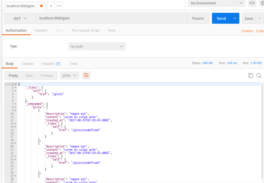I launched my REST client -postman and executed an HTTP GET of localhost:3000/gists as per screenshot below.