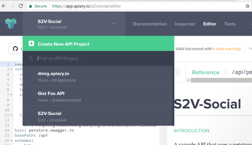 Having proved that my API application was working, I then turned my attention to address the tooling requirements for my API Design. I pointed my browser to the Apairy web site. As I mentioned earlier Apiary is a web based repository for API documentation. Apiary also provides server mocking, code samples, automated testing, and GitHub sync. It is currently available with different subscription plans, free, standard (team) and pro. These different plans provide capabilities to suit most needs including both public and private API documentation.