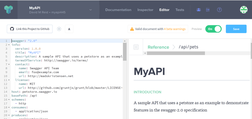 You will notice that when the API project is created, that the PetStore API sample is automatically populated as your project API design, as per my “MyAPI” project screenshot below.