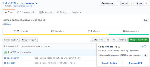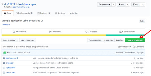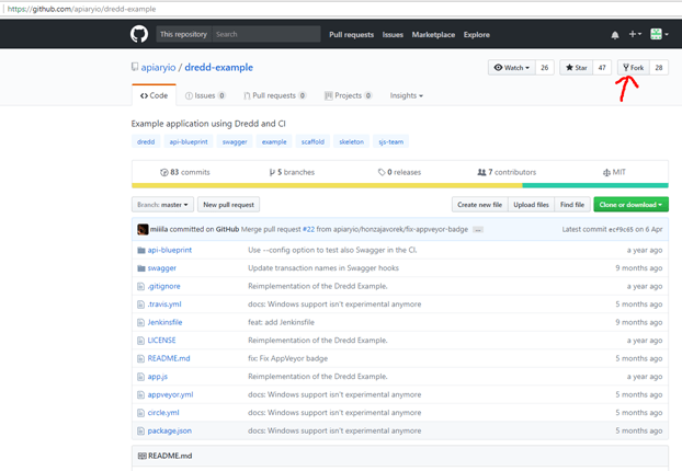 After logging into GitHub, search for the project https://github.com/apiaryio/dredd-example
