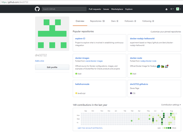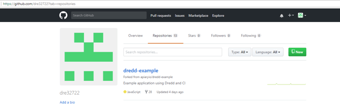 I now needed to access the forked copy of the Dredd-Example project. This project will be visible under the Repositories tab for my GitHub account (dre32722) as per screenshot below.