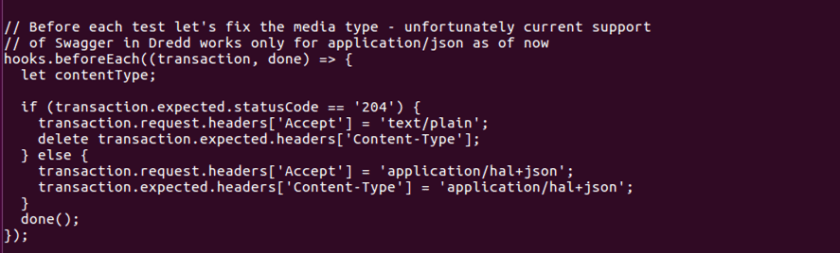 If you look inside the hooks.js file, you will notice the tests that dredd will run. One of the tests is shown in the screenshot below.