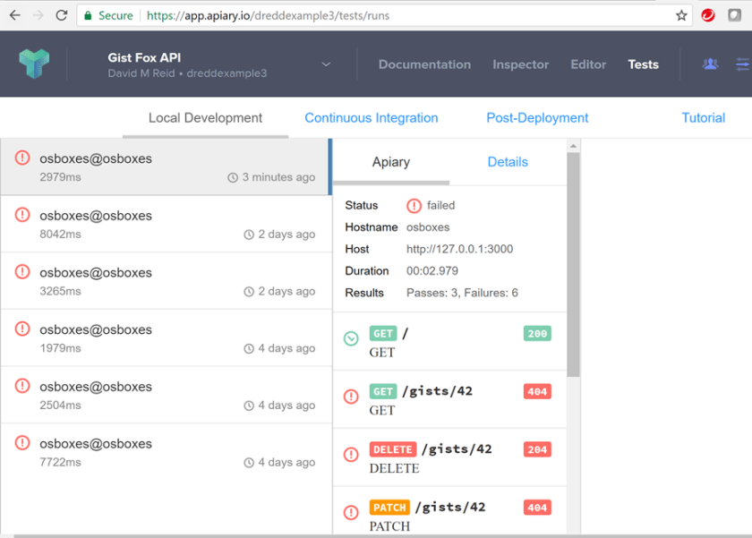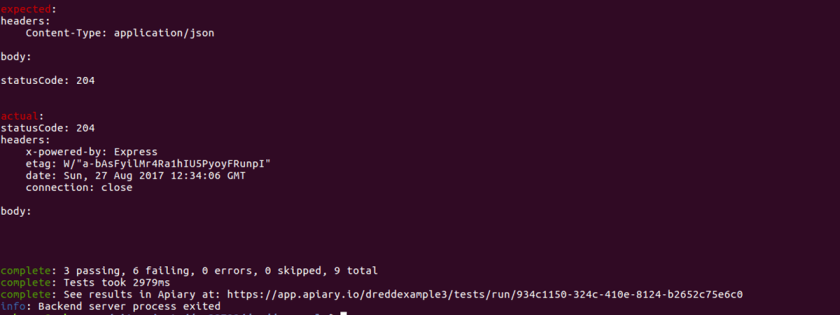 This is essentially what I wanted to validate when I started this exercise, the dredd tests are highlighting that there has been some drift from my API design (Apiary – Swagger formatted documentation) and the implementation code.