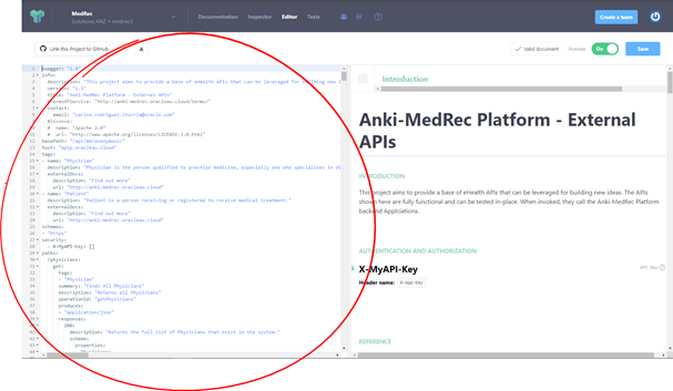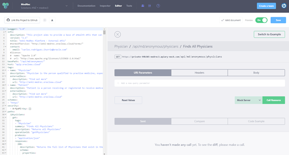 - At this moment you can start using the left side of the Apiary tool to define your APIs using the Swagger definition. The tooling is going to provide templates and real-time validations that will guide you to quickly build an error-free swagger definition that matches your API requirements. For now, we are going to use the existing MedRec Swagger definition that comes in the MedRec GitHub repository. For this, go back to your GitHub forked MedRec (ankimedrec-apis) repository. This can be on web or locally on your hard disk if you decided to clone it locally.